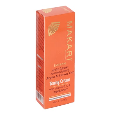 Makari Extreme Active Intense Toning Cream with Argan and carrot oil removes blemishes and increases radiance as well as fades dark areas of the skin such as freckles, age and liver spots.